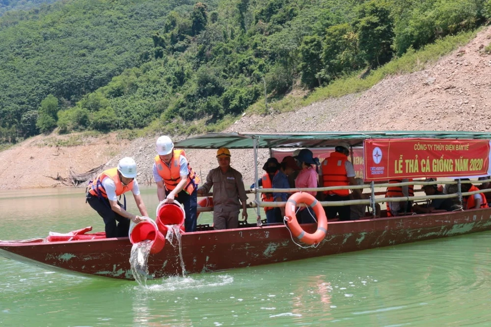 Lãnh đạo EVNGENCO1, Thủy điện Bản Vẽ và UBND huyện Tương Dương (Nghệ An) thả cá giống năm 2020. Ảnh: NTV