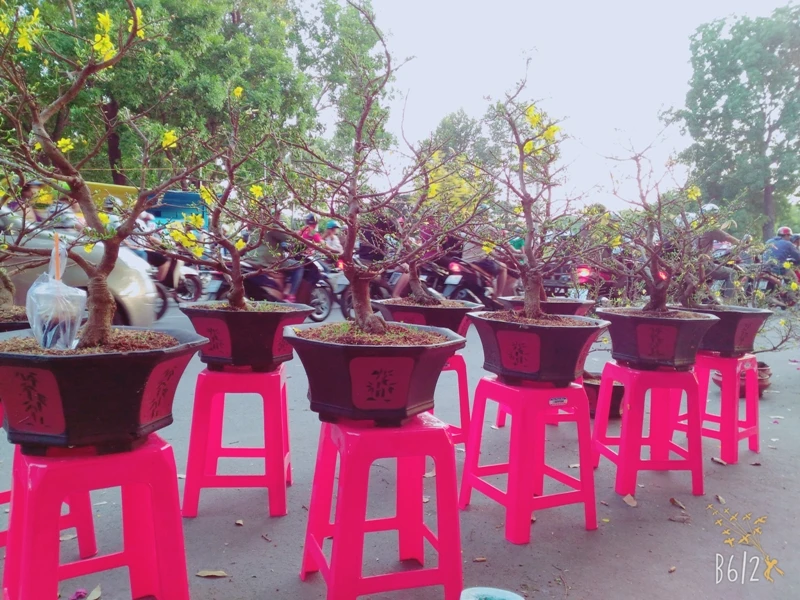 Những chậu mai được bày bán trên đường Hoàng Minh Giám. Ảnh: NGUYỄN TRÀ