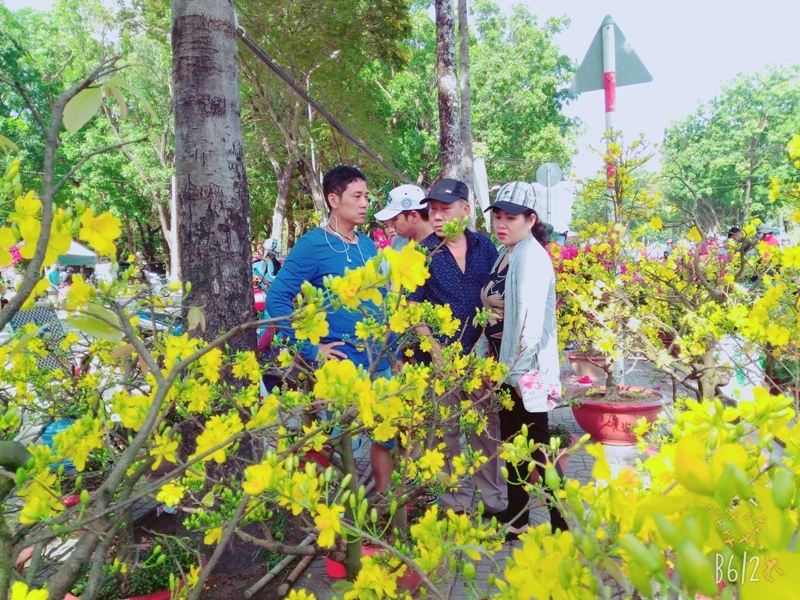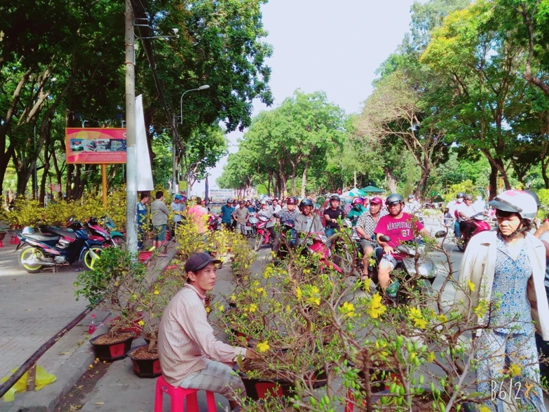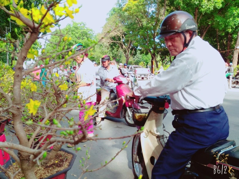 Chiều 30 tết hàng trăm người chen chúc trên đường Hoàng Minh Giám, công viên Gia Định để mua hoa kiểng xổ rẻ. Ngày cuối năm mưa lớn, sau đó nắng to nên nhiều chậu chậu mai đã nở tung xòe.