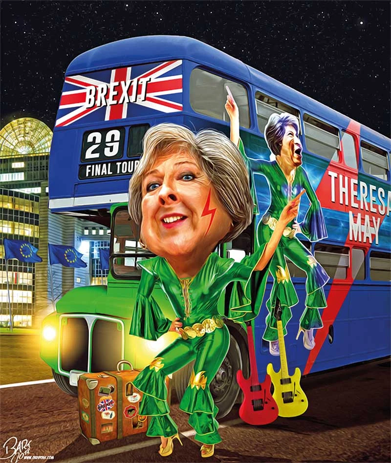 Thủ tướng Anh Theresa May quyết khởi động Brexit từ đêm 29-3-2019. Biếm họa: Bart van Leeuwen (Hà Lan)