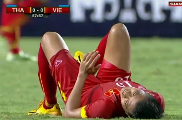 Phút 55, cầu thủ vừa vào sân thay người của Việt Nam, Đinh Tiến Thành đang phải nằm sân vì chấn thương.