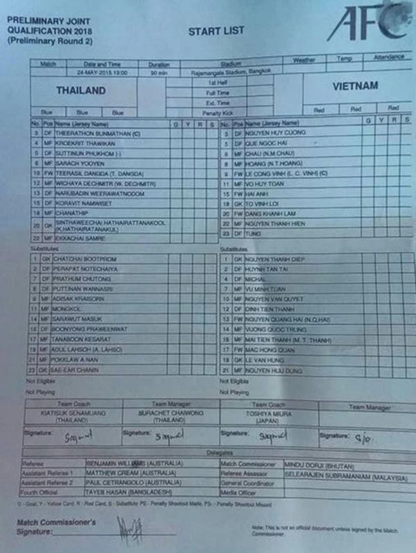Thái Lan: Hathairatanakul, Bunmathan, Phukhom, Weerawatnodomm Namwiset, Chanathip, Dechmitr, Yooyen, Thawikan, Samre, Dangda.
