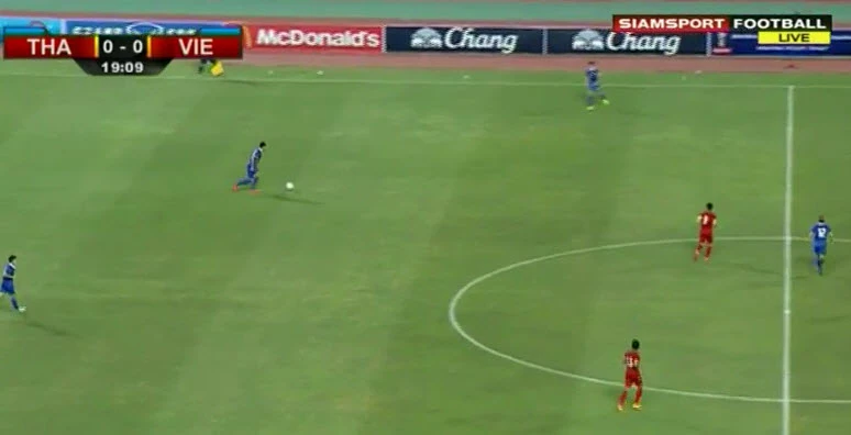 Lối chơi tấn công của người Thái trong hiệp 1 thật sự rất ấn tượng, họ chủ động trong tấn công với nhiều phương án đa dạng, từ tấn công biên đến thực hiện những đường chuyền vượt tuyến đánh thẳng vào trung lộ cho các tiền đạo phá bẩy việt vị băng xuống. Cả hiệp thi đấu thứ nhất, Thái Lan cầm đến 64% thời lượng kiểm soát bóng và nắm hoàn toàn thế trận.