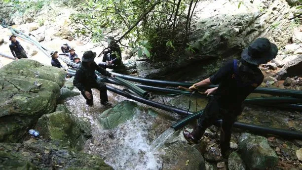 Lực lượng cứu hộ tháo nước ra khỏi hang. Ảnh: AP