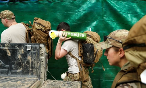 Nhân viên cứu hộ di chuyển bình dưỡng khí. Ảnh: REUTERS