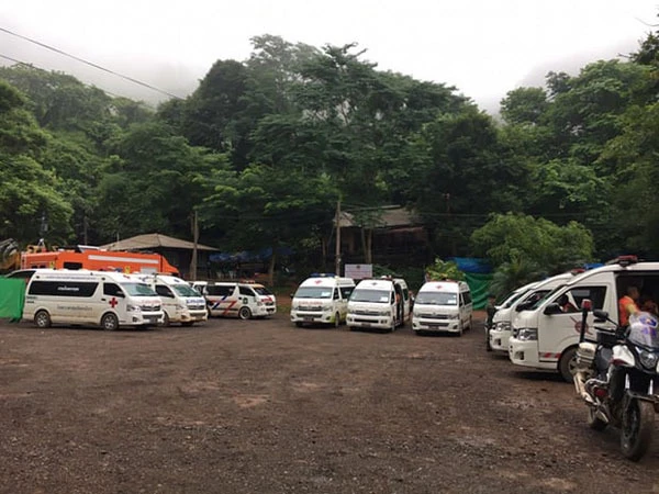 Xe cứu thương chờ sẵn bên ngoài hang. Ảnh: Guardian