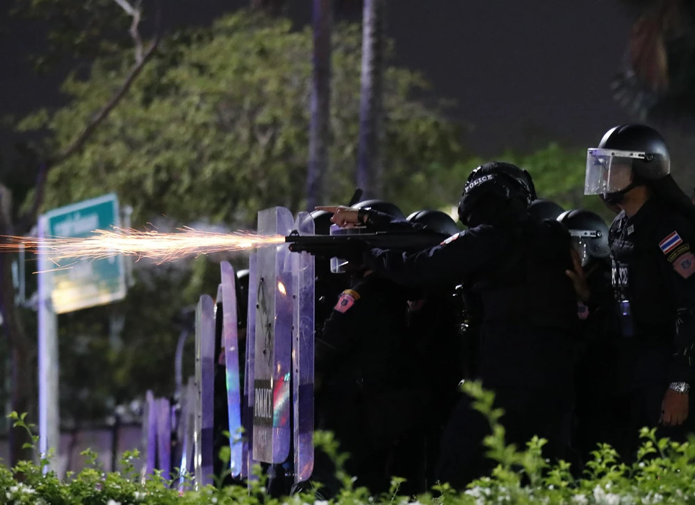 Cảnh sát bắn đạn cao su về phía người biểu tình trước hoàng cung ở thủ đô Bakok, Thái Lan ngày 20-3. Ảnh: AP