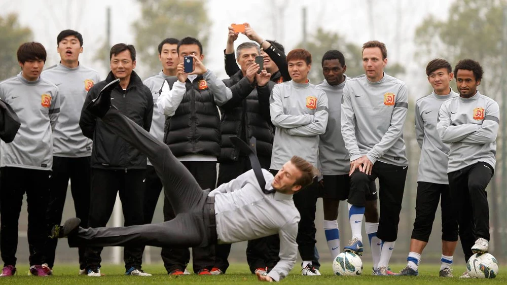 CLB Wuhan Zall chiêm ngưỡng Beckham trổ tài... Ảnh: GETTY