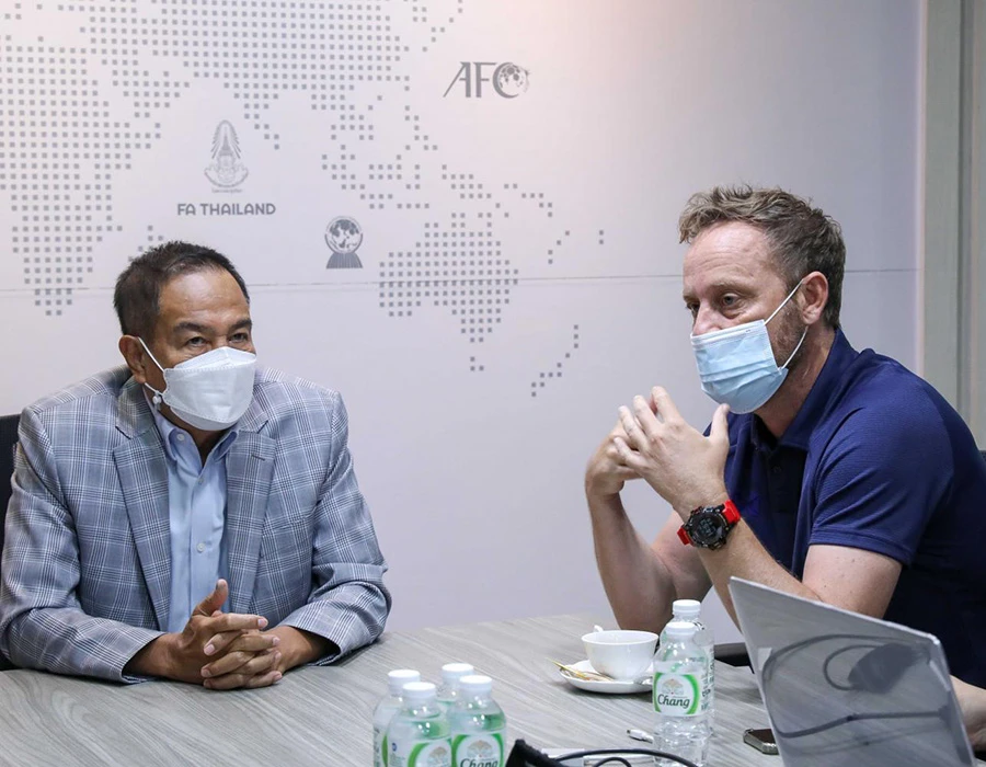 HLV Polking (phải) lo lắng bên chủ tịch LĐBĐ Thái Lan. Ảnh: FAT