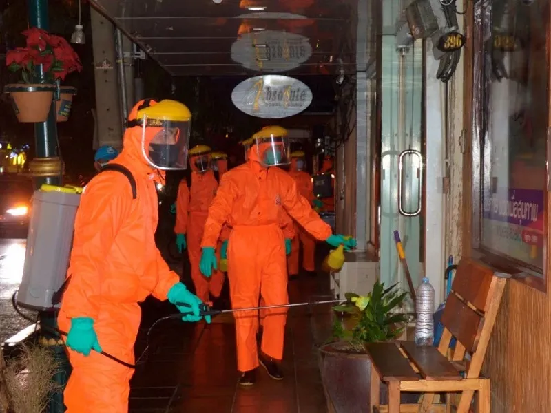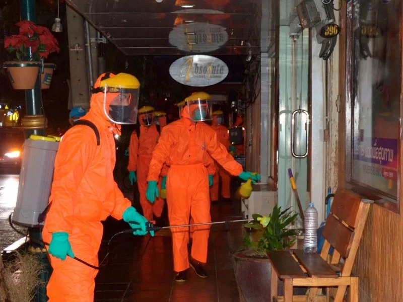 Các nhân viên y tế Bangkok khử trùng một khu phố để ngăn chặn dịch COVID-19 lây lan. Ảnh: BERNAMA