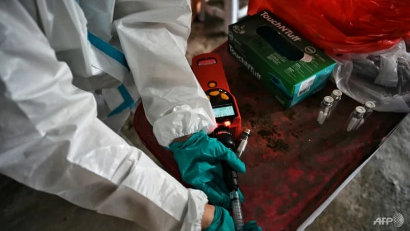 Nhân viên y tế lấy mẫu tăm bông cho vào ống nghiệm thủy tinh và tiến hành khử trùng. Ảnh: AFP