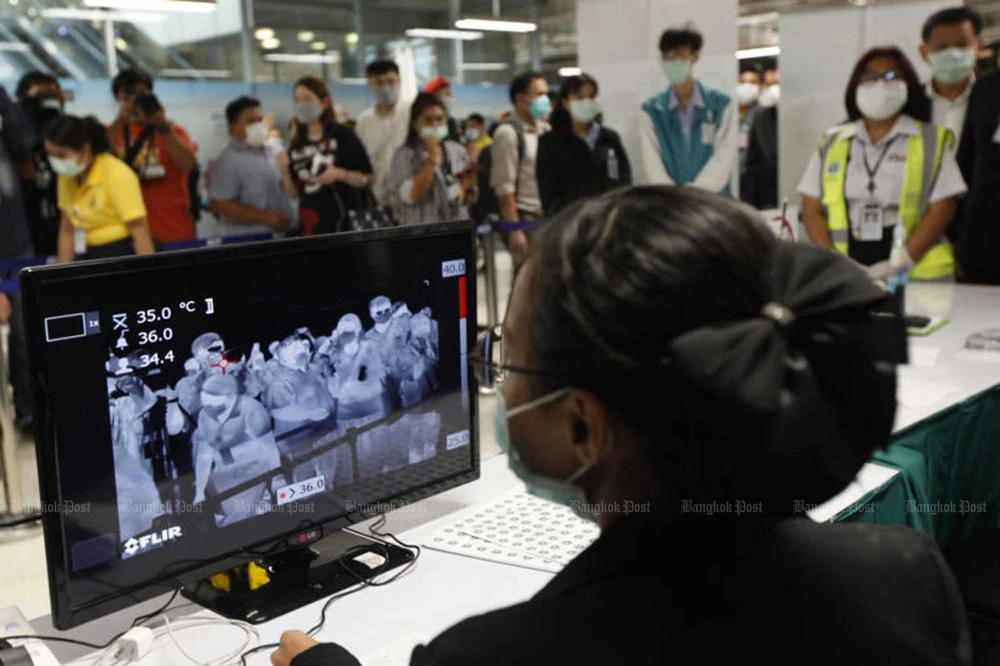 Quét thân nhiệt hành khách tại sân bay quốc tế Suvarnabhumi. Ảnh: BANGKOK POST