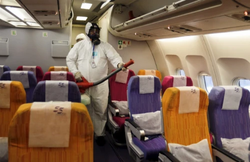 Một thành viên của phi hành đoàn Thai Airways tẩy sạch các cabinmáy bay để phòng ngừa MERS lây lan. Ảnh:Reuters.