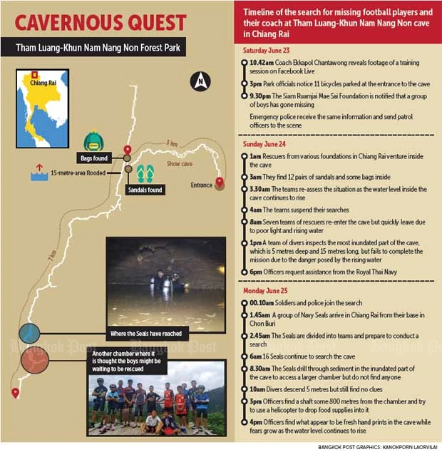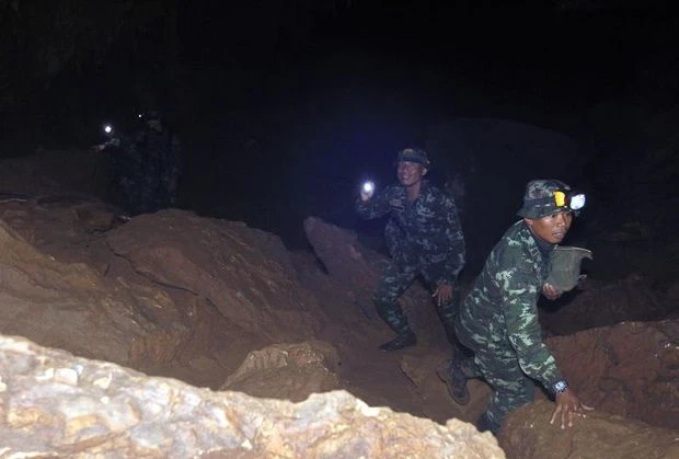 Hàng chục thợ lặn chuyên nghiệp thuộc Hải quân Thái Lan tiếp tục công cuộc tìm kiếm 12 cầu thủ nhí, học sinh từ 12 đến 16 tuổi và HLV 25 tuổi bị mất tích trong hang động khi toàn đội đi tập luyện kết hợp dã ngoại.