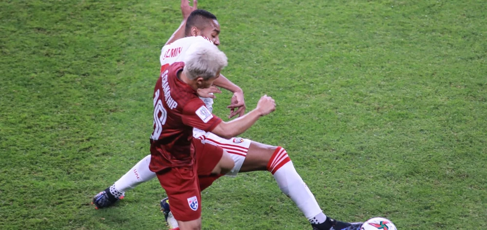 Adisak trong pha tranh chấp với cầu thủ UAE.