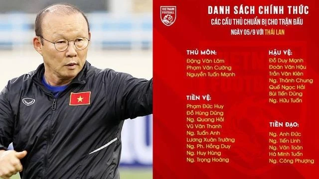 Tờ Siam Sports cho biết HLV Park Hang-seo đã gút danh sách 24 cầu thủ để ngày 1-9 sang Thái Lan, trong số này có cả hai cầu thủ đang chấn thương là Nguyễn Trọng Hoàng và Đoàn Văn Hậu, HLV Park Hang-seo tin rằng, hai cầu thủ này chóng hồi phục chấn thương để kịp ra sân trận đấu ngày 5-9.