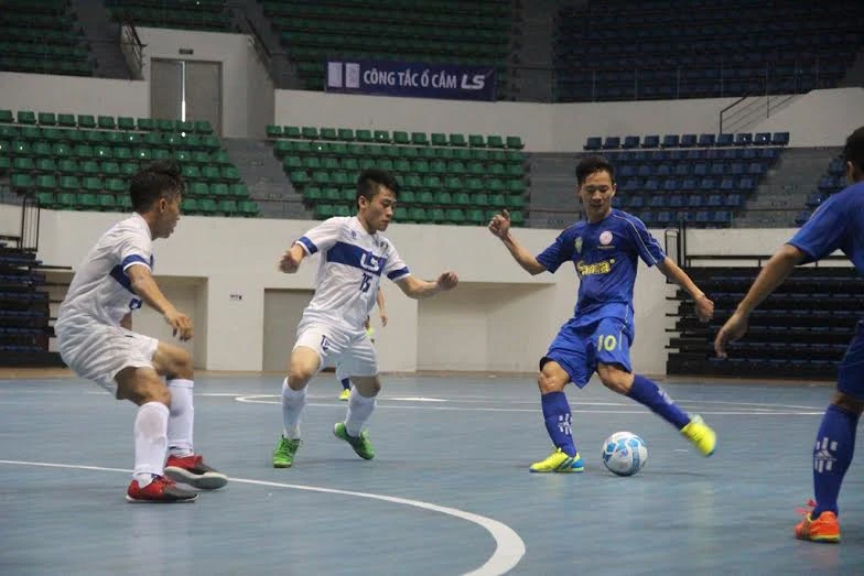 Thái Sơn Nam (áo trắng) đánh bại Sanna Khánh Hòa nhưng chưa thể truất ngôi đầu bảng của đội bóng phố biển.