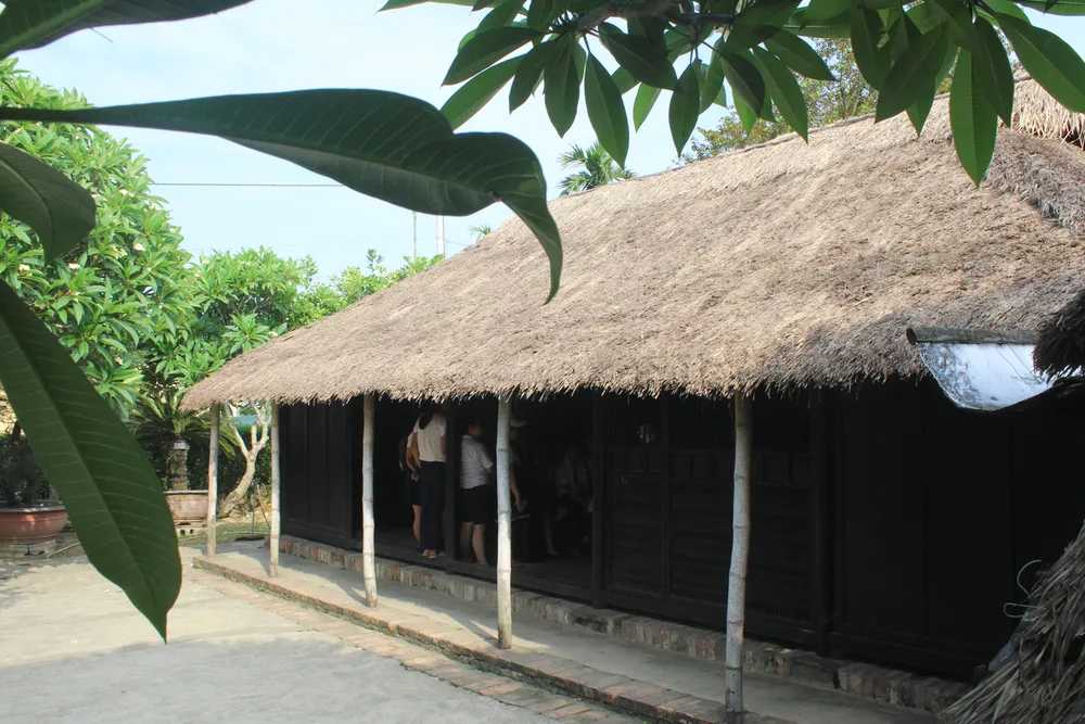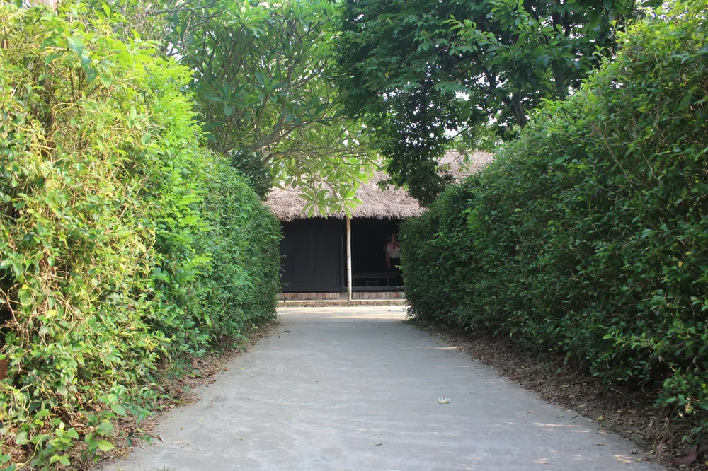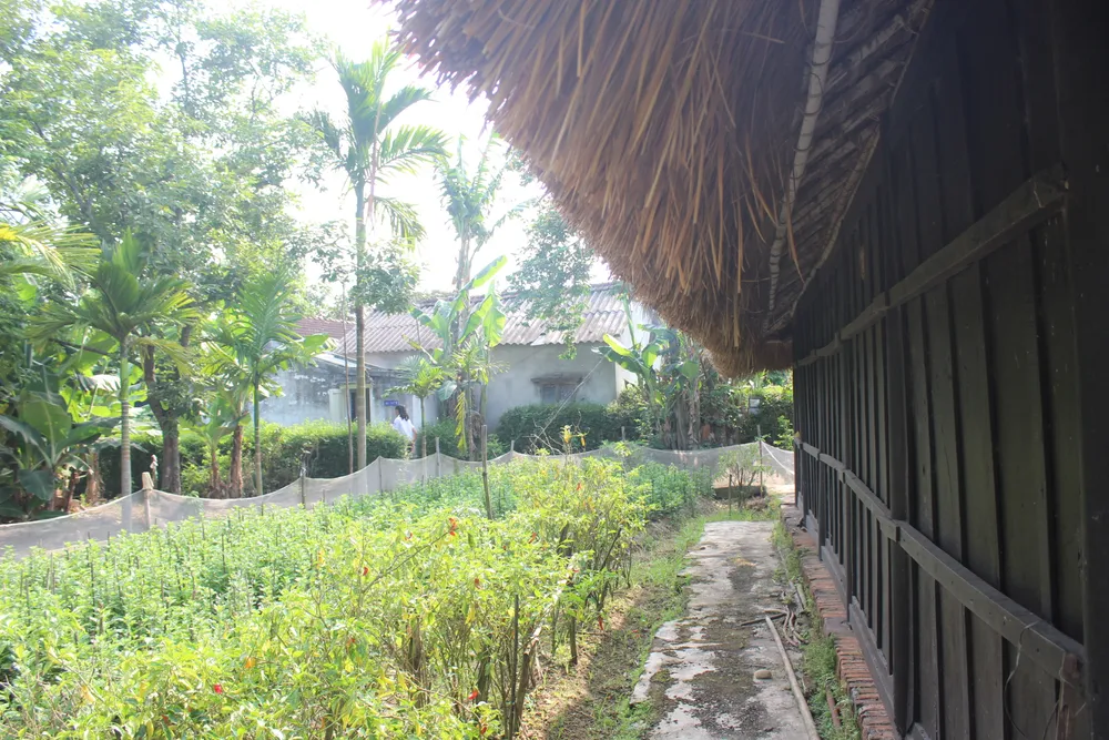 Căn nhà ba gian mái ngói đơn sơ, xung quanh được dựng bằng gỗ ván. Lối vào được trồng nhiều cây chè tàu xanh mướt, quanh nhà hàng cau và những dãy hoa sứ tỏa bóng.