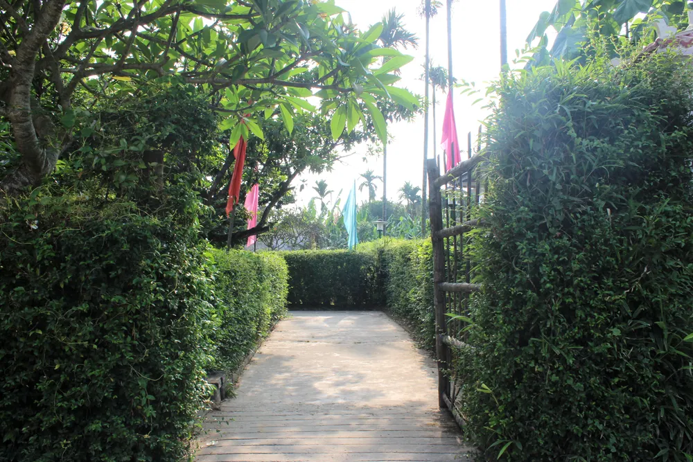 Lối dẫn vào ngôi nhà được trồng hàng chè tàu xanh mướt.