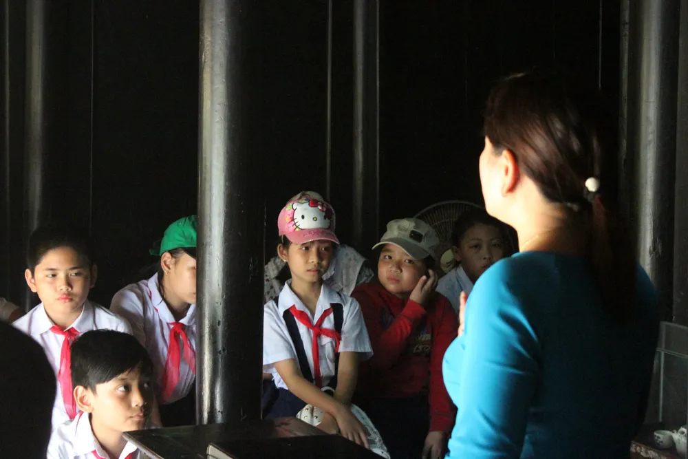 Các em học sinh chăm chú lắng nghe về những ngày tháng Bác Hồ ở Huế.