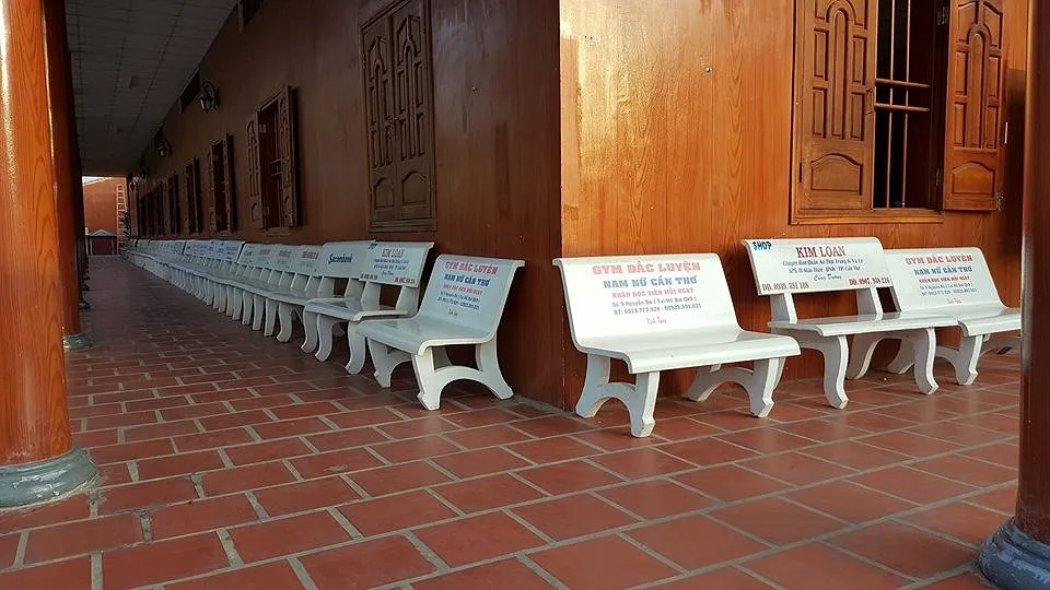 Thảm hơn, khắp nơi trong sân chùa tràn ngập các băng ghế đá mài đặt san sát nhau, lưng ghế chi chít các dòng quảng cáo, nào trường dạy lái xe, lớp học Anh văn, cơ sở tập gym, làm tóc với đầy đủ địa chỉ, cơ sở 1, cơ sở 2, giờ mở cửa...