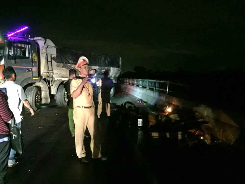 Tại hiện trường, một đoạn lan can cầu bị xe ben tông gãy nát. Vụ tai nạn đã làm ùn tắc giao thong cục bộ. Khám nghiệm tử thi, một phần thân thể của hai nạn nhân được xác định bị rơi xuống cầu và bị nước cuốn trôi.