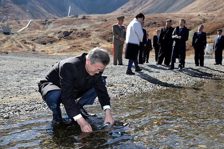 Tổng thống Moon Jae-in lấy nước từ hồ Cheonji trên núi Paekdu. Ảnh: REUTERS