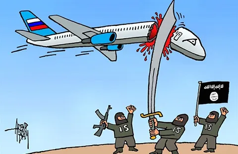 Nghi vấn khủng bố Nhà nước Hồi giáo (IS) trên bán đảo Sinai làm rơi máy bay Nga. Biếm họa của AREND VAN DAM (Hà Lan).