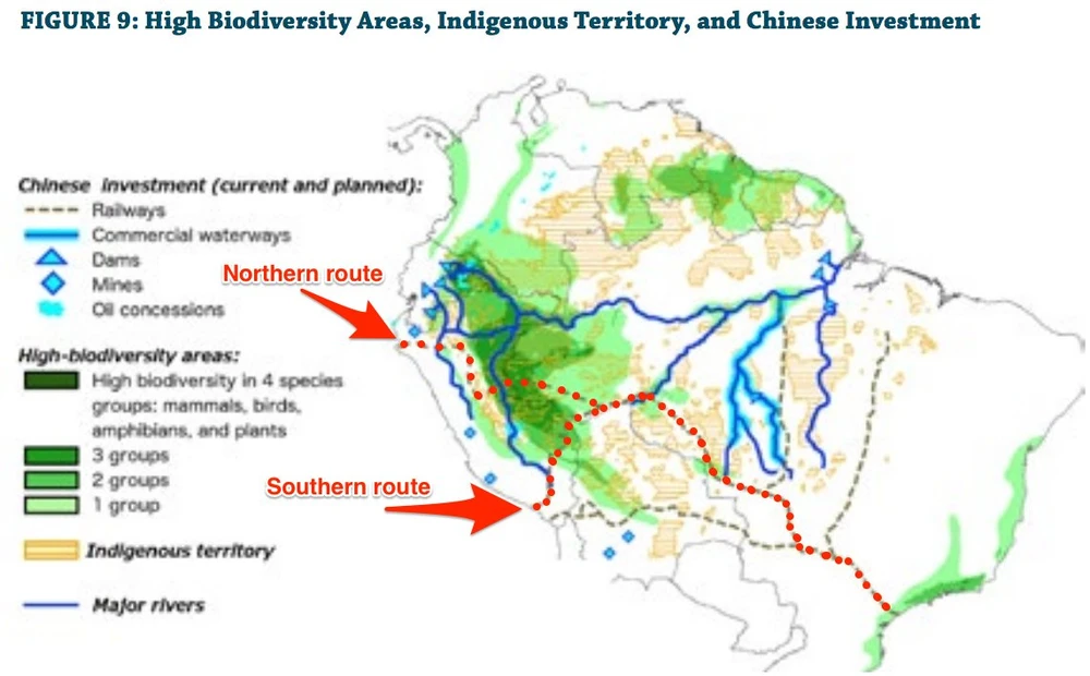 Còn có một tuyến đường đề xuất khác còn đáng lo ngại hơn. Một nghiên cứu của Đại học Boston cũng cho thấy rằng tuyến đường được đề xuất phía bắc sẽ đi qua bắc Peru và cắt ngang Brazil ở khu vực có “độ đa dạng sinh học rất cao" . Các tuyến đường sắt khác từ trước đến nay đều phải tránh khu vực này.