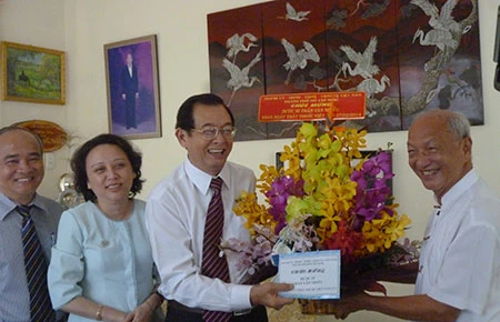 Đoàn lãnh đạo TP chúc mừng Anh hùng lao động Trần Văn Nhiều. Ảnh: HOÀNG LAN