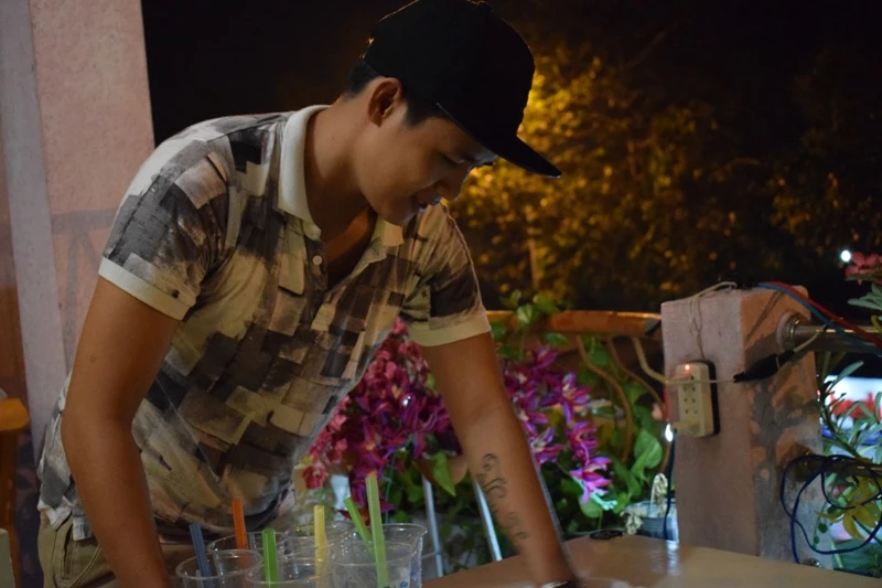 Sau khi chạy xe lấy hàng trên thành phố về “Hot boy trà sữa” xuất hiện giản dị trong chiếc áo thun, quần kaki và mũ lưỡi trai đen quen thuộc. Anh phụ pha trà sữa, đưa mì cay… đến từng bàn cho khách.
