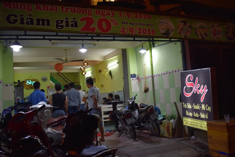 Hơn 10 giờ đêm trong khi nhiều cửa hàng lớn đã đóng cửa thì quán Sky của anh vẫn tấp nập người ra vào. Từ đầu giờ chiều, sáu, bảy người anh em, bạn bè trong nhà thay nhau phụ việc, người pha trà sữa, người nấu mì cay, người trông xe cho khách.