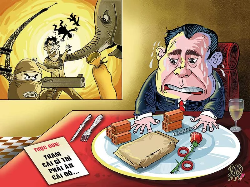 Việt Nam: Ở Việt Nam, sắp tới nghe nói sẽ ban hành luật mới, nghĩa là đứa nào tham nhũng cái gì sẽ phải ăn vào mồm cái đấy. Nghe đến đây, những kẻ tham nhũng xi măng, sắt thép, một dạng ăn cắp rất phổ biến trong xây dựng run sợ đến toát mồ hôi vì chỉ cần nuốt nửa ký xi măng là ruột sẽ đông cứng lại, không còn nuốt thêm được cái gì cho đến tận cuối đời.