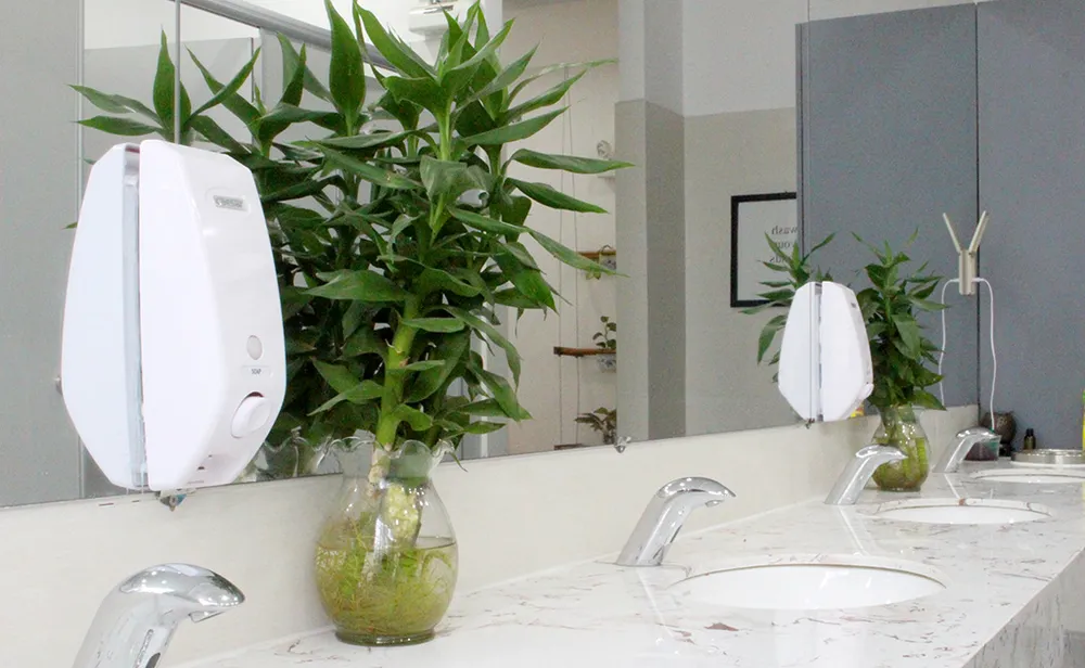 Bồn rửa mặt sạch sẽ, cũng được đặt hai chậu cây.