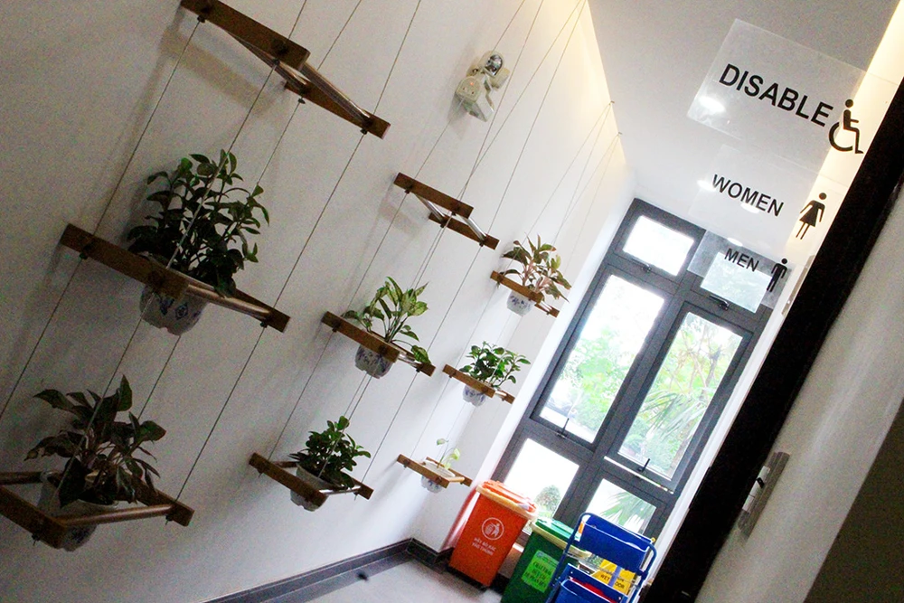 Khu vực NVS ở đây ngoài hai phòng dành cho nam và nữ thì còn có phòng riêng dành cho người khuyết tật. Ngay từ hành lang bước vào NVS, phía bên trái là những chậu cây xanh mát mẻ, bên phải là bảng điện tử dùng để đánh giá sự hài lòng.