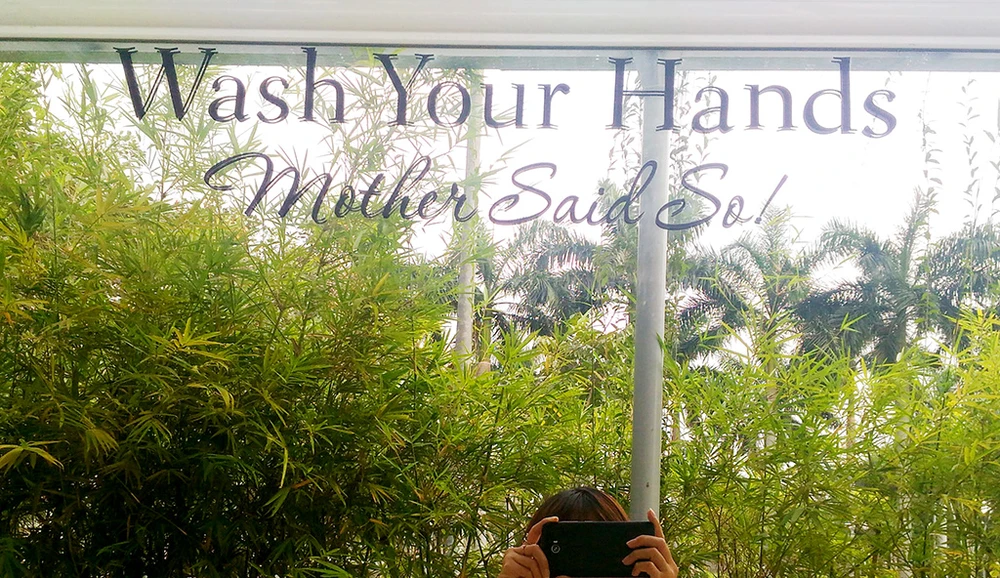 Cạnh đó là NVS ở khu vực Tiếp nhận và trả hồ sơ nằm tách biệt với khu hành chính. Nơi này tuy có nhỏ hơn nhưng vẫn đủ ba phòng dành cho nam, nữ và người khuyết tật. Bồn rửa tay dùng chung được đặt ngay ở bên ngoài cho thoáng mát, mặt gương soi in bóng hàng cây mát rượi. Bên trên in dòng chữ “Wash your hands. Mother said so!” để hướng dẫn người dân rửa tay.