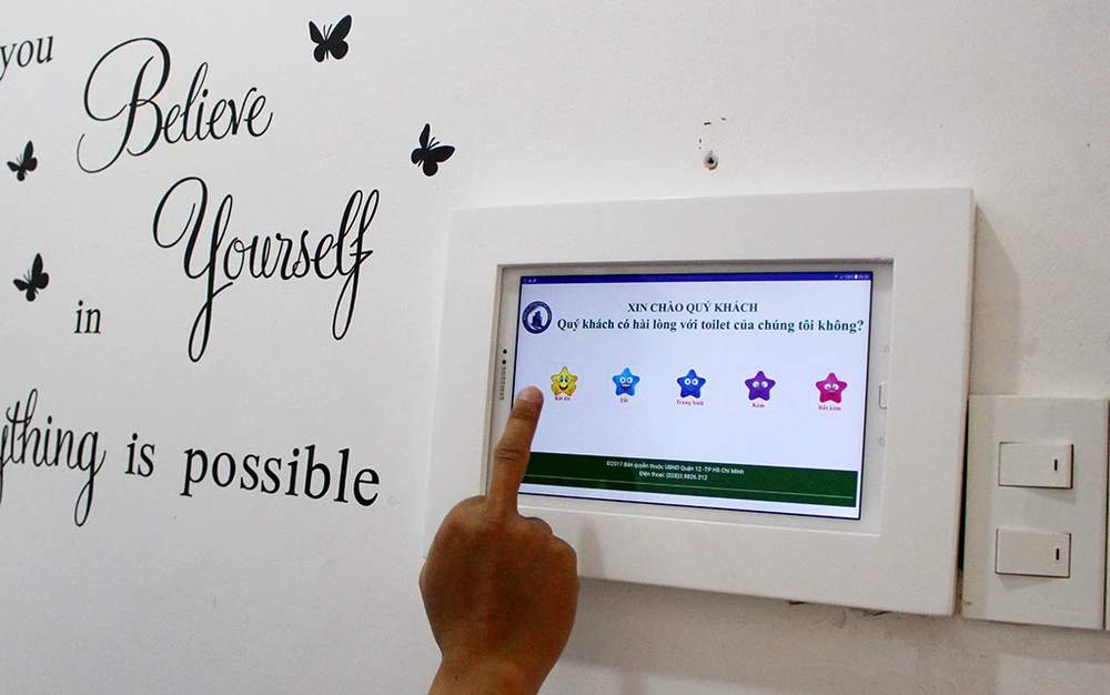 (PLO)- Nhiều người thích thú khi bước ra khỏi nhà vệ sinh (NVS) tại UBND quận 12 khi được đánh dấu sự hài lòng của mình thông qua 5 dấu "sao".