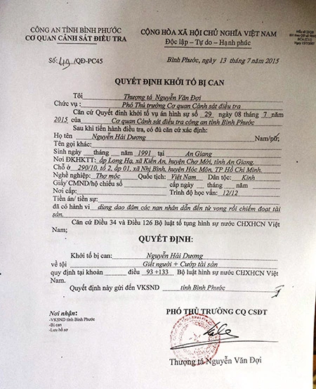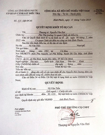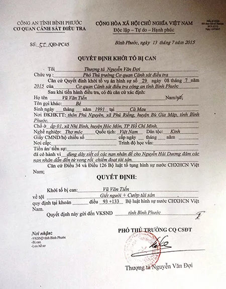 Trước đó, chiều nay (13-7), thông tin từ Cơ quan cảnh sát điều tra tỉnh Bình Phước cho biết đã chuyển hồ sơ lên Viện kiểm sát tỉnh đề nghị phê chuẩn quyết định khởi tố bị can và lệnh tạm giam 4 tháng với 2 nghi can Nguyễn Hải Dương và Vũ Văn Tiến trong vụ thảm sát Bình Phước làm 6 người chết về tội giết người, cướp tài sản.