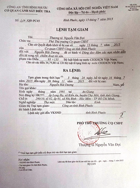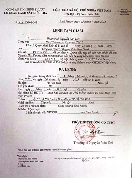 Lệnh tạm giam 2 nghi can Nguyễn Hải Dương và Vũ Văn tiến.