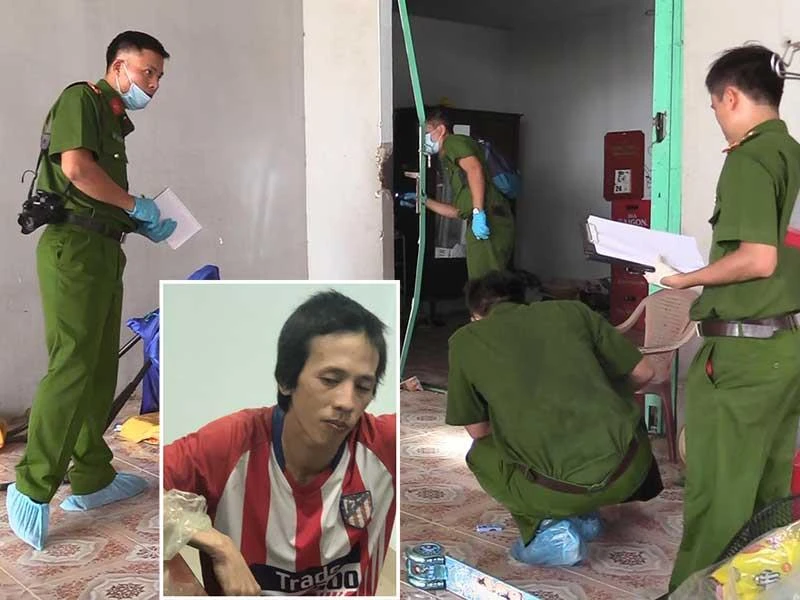 Công an khám nghiệm hiện trường vụ thảm án. Trần Trọng Luận (ảnh nhỏ), nghi can thảm sát ba người ở Bình Dương. Ảnh: L.ÁNH