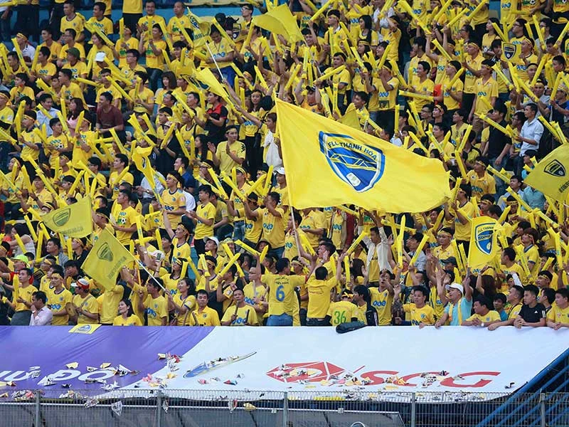 Bóng đá Thanh Hóa có sức mạnh rất lớn từ giới cổ động viên (ảnh dưới) khao khát một lần lên đỉnh V-League nhưng rất ngại Hà Nội của bầu Hiển. Ảnh: QUANG THẮNG