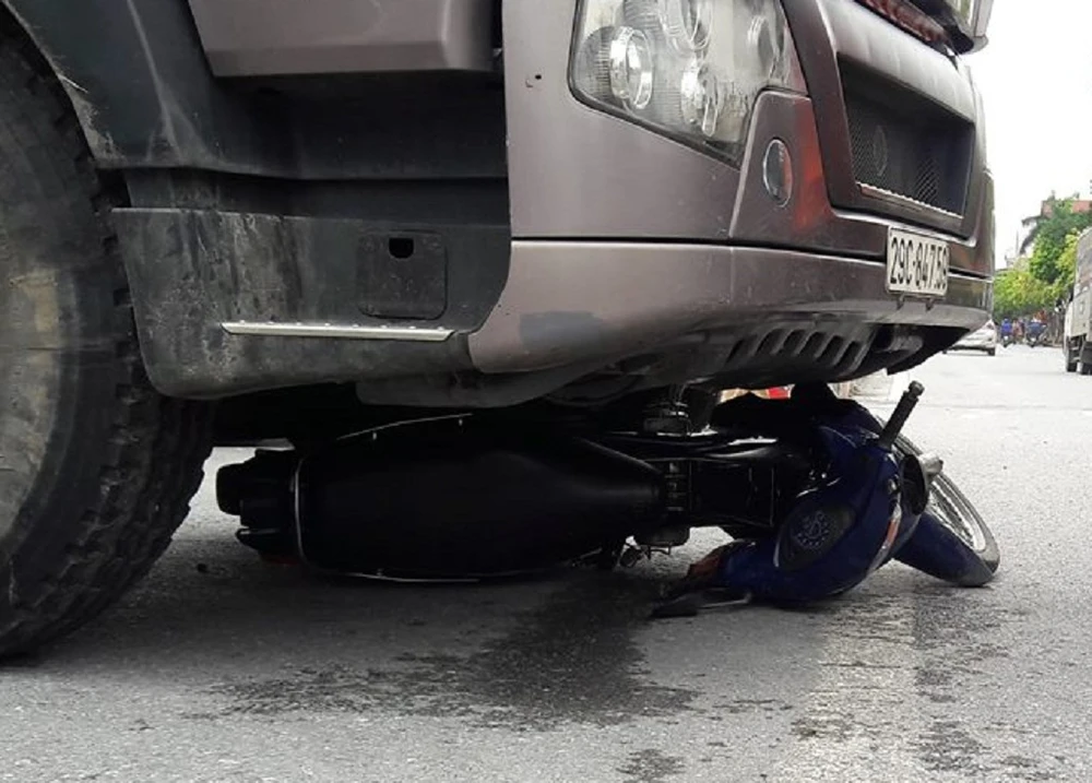Chiếc xe máy bị cuốn vào gầm xe tải