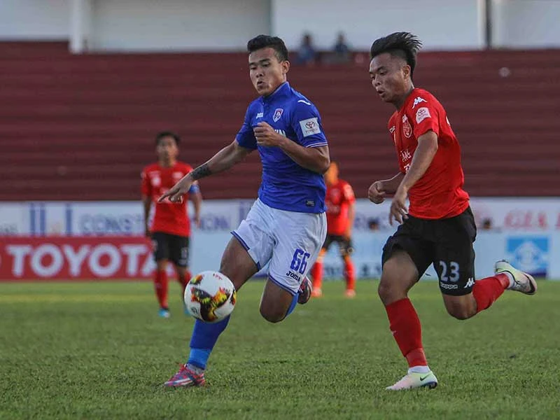 Quảng Nam (trái) đang rút về đích với thiên thời, địa lợi, nhân hòa. Ảnh: HUY PHẠM