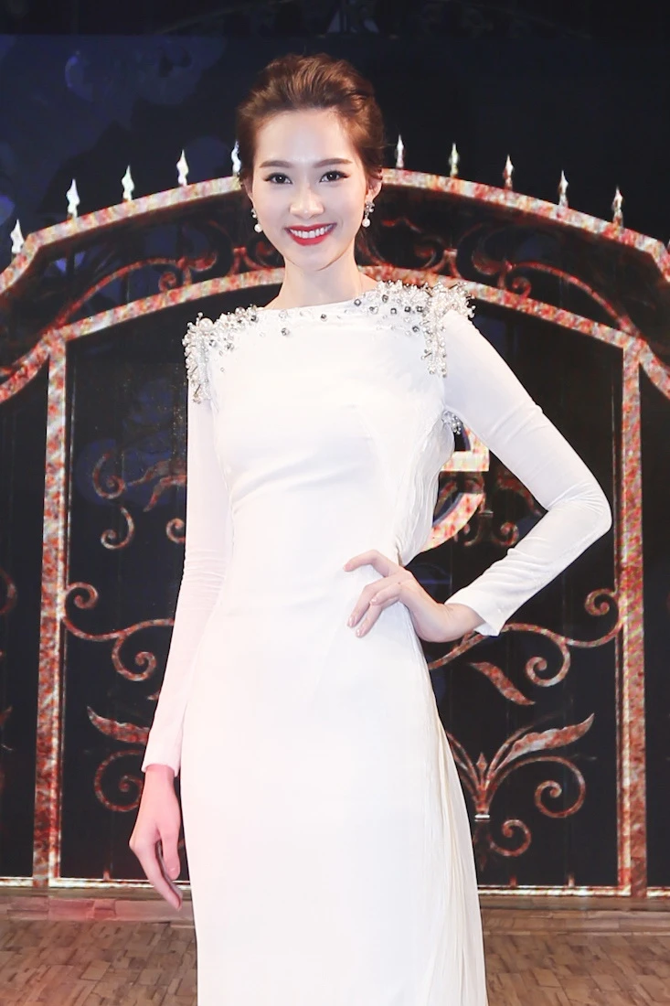 Hoa hậu “thần tiên tỉ tỉ” xuất hiện rạng ngời trước chín nhà thiết kế trẻ trong bộ đầm trắng thanh lịch.