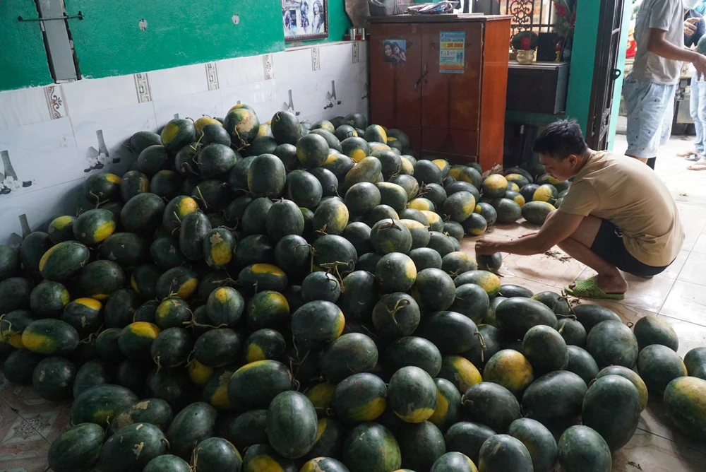 Dưa hấu của người nông dân Quảng Nam không thể xuất khẩu do bị ngập trong nước. Ảnh: BT.