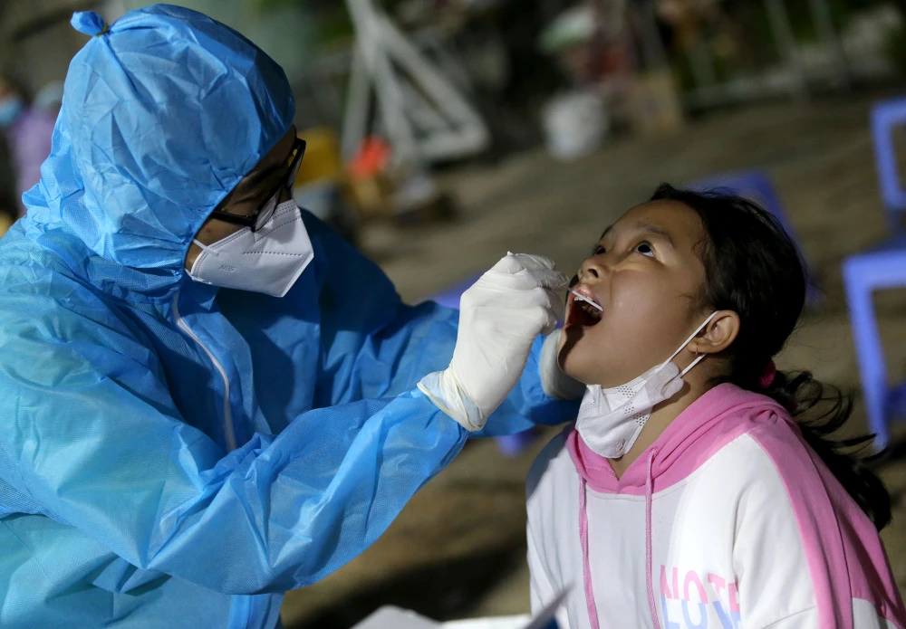 Một em nhỏ được lấy mẫu xét nghiệm COVID-19 trong đêm.