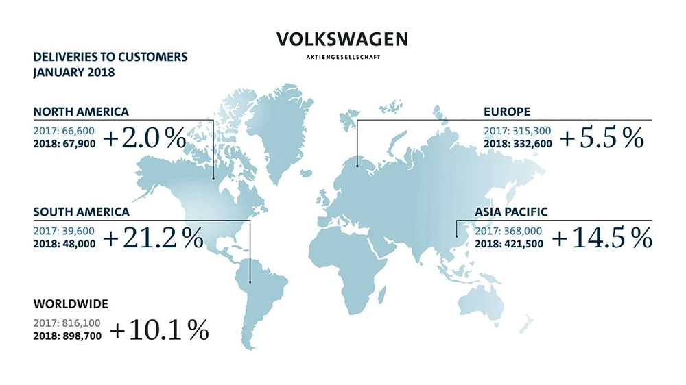 Tập đoàn Volkswagen đã chuyển giao 898.700 xe cho khách hàng trên toàn thế giới trong tháng đầu tiên của năm nay. “Các thương hiệu của Tập đoàn Volkswagen đã có một khởi đầu tuyệt vời cho năm 2018. Tốc độ tăng trưởng của tất cả khu vực đã tăng lên đáng kể. Nhìn chung, trong tháng 1 vừa qua, tập đoàn đã tăng trưởng hơn 10%, đó là sự khởi đầu tốt nhất trong lịch sử của Tập đoàn Volkswagen”, Fred Kappler, Giám đốc Bán hàng tại Volkswagen Aktiengesellschaft bình luận.