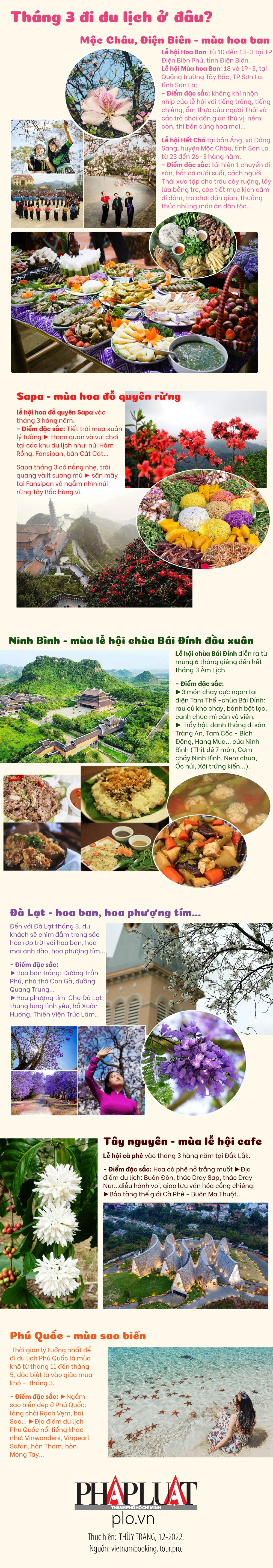 (PLO)- Tháng 3 là thời điểm lý tưởng để đi du lịch trong nước với nhiều điểm đến thú vị dọc 3 miền Bắc, Trung, Nam như: Lễ hội hoa ban Mộc Châu, mùa hoa phượng tím Đà Lạt, hoa đỗ quyên rừng Sa Pa hay mùa sao biển Phú Quốc...