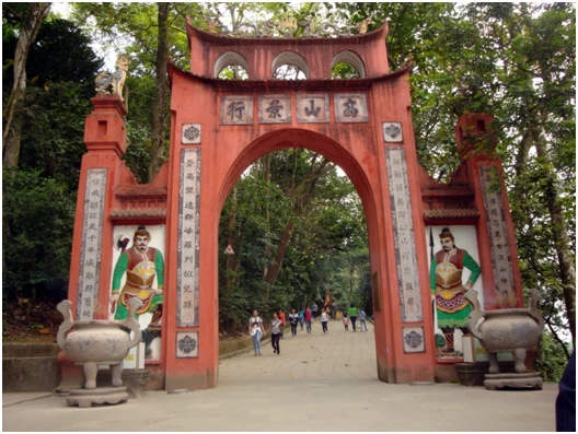 Xây năm 1917, hướng chếch Nam, kiểu vòm cuốn, cao 8m5, hai tầng 8 mái, lợp giả ngói ống, có cửa vòm cuốn, 4 góc tầng mái trang trí Rồng, đắp nổiNghê. Cột trụ và cổng đắp phù điêu võ sỹ cầm giáo và rìu chiến. Giữa tầng là đại tự: “Cao sơn cảnh hành” (Lên núi cao nhìn xa rộng) hay“Cao sơn cảnh hạnh” (Đức lớn như núi cao). Mặt sau cổng đắp hổ canh giữ thần.Từ cổng đền, vượt 225 bậc thang là đến đền Hạ.