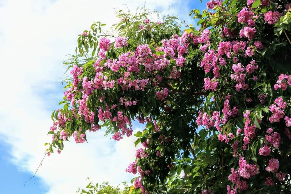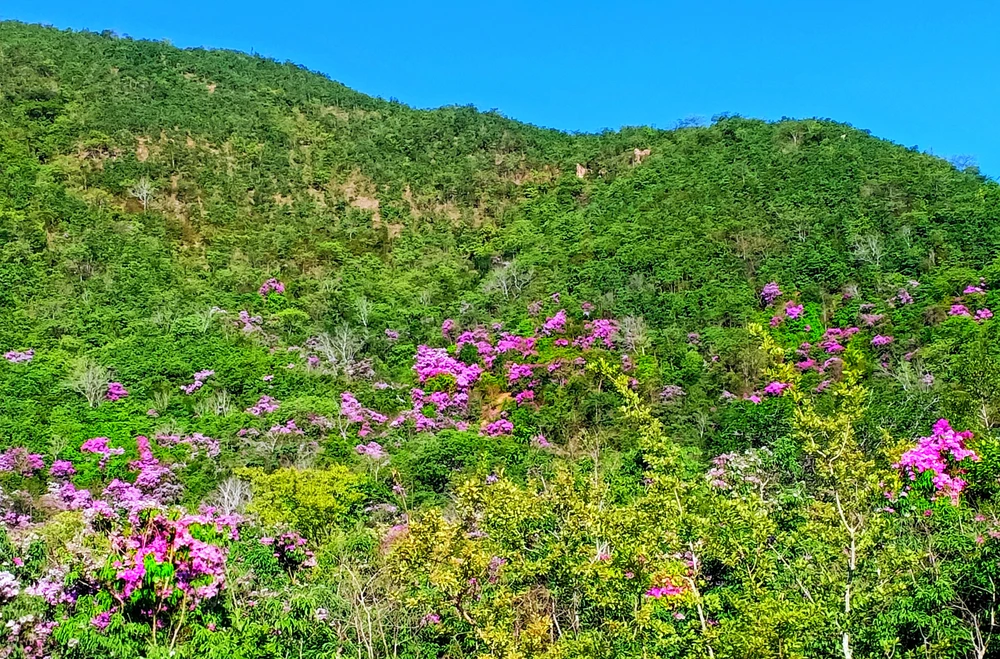 Ngay con dốc đầu tiên ta đã thấy bằng lăng lấp ló tím rực rỡ ven đường. Leo lên ụ đất ven đường chắc hẳn bạn sẽ òa lên khi nhìn phía thung lũng trải dài đến ngang sườn núi rực sắc hoa. Di chuyển qua các tuyến đường ở trung tâm xã, vòng qua hồ thủy lợi Sông Sắt, ngược lên phía cầu Ô Căm đi đâu cũng bắt gặp hoa Bằng Lăng đang rộ.